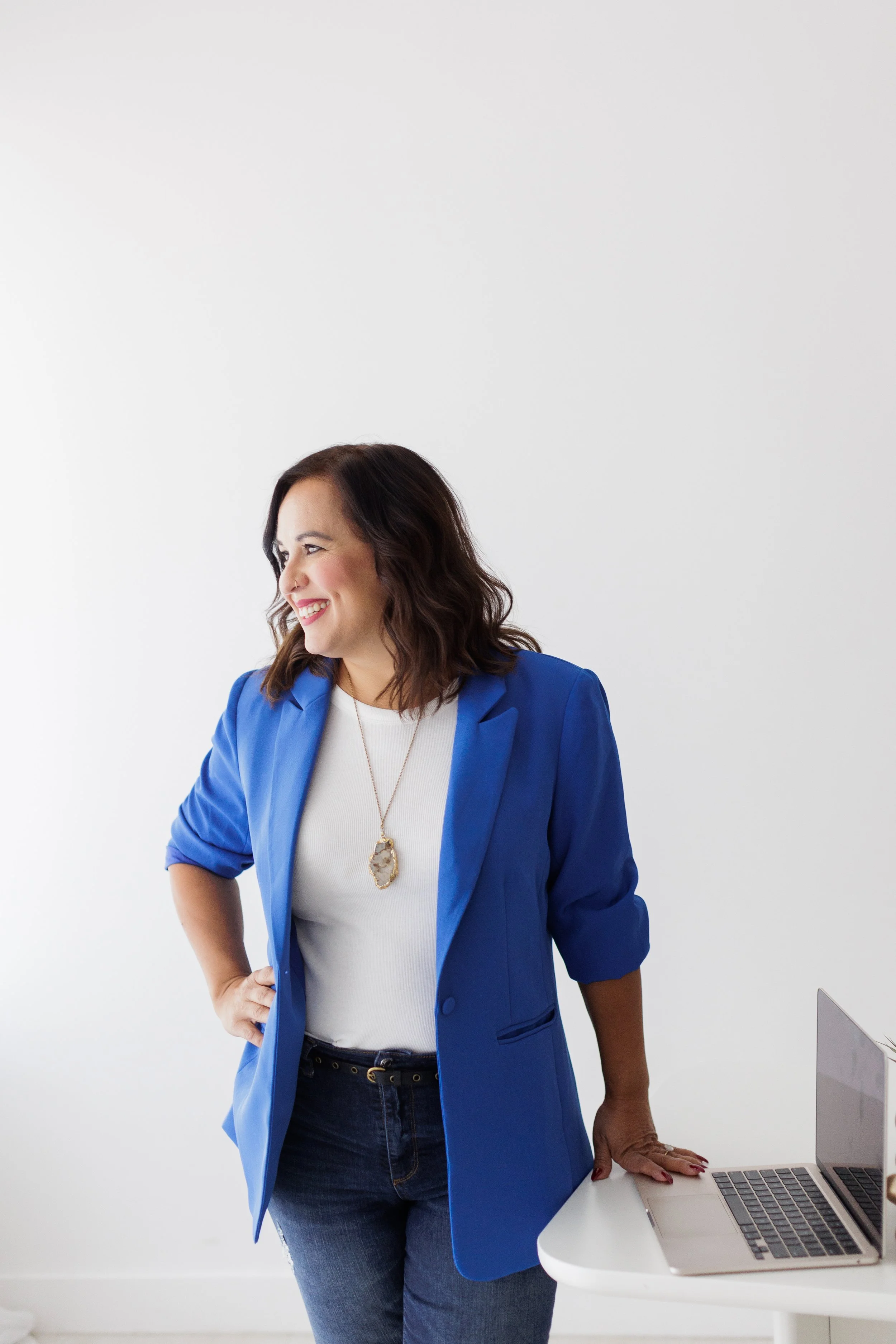 A woman with shoulder-length brown hair, wearing a blue blazer and white shirt, standing next to a white table with a laptop, smiling while looking to her left.